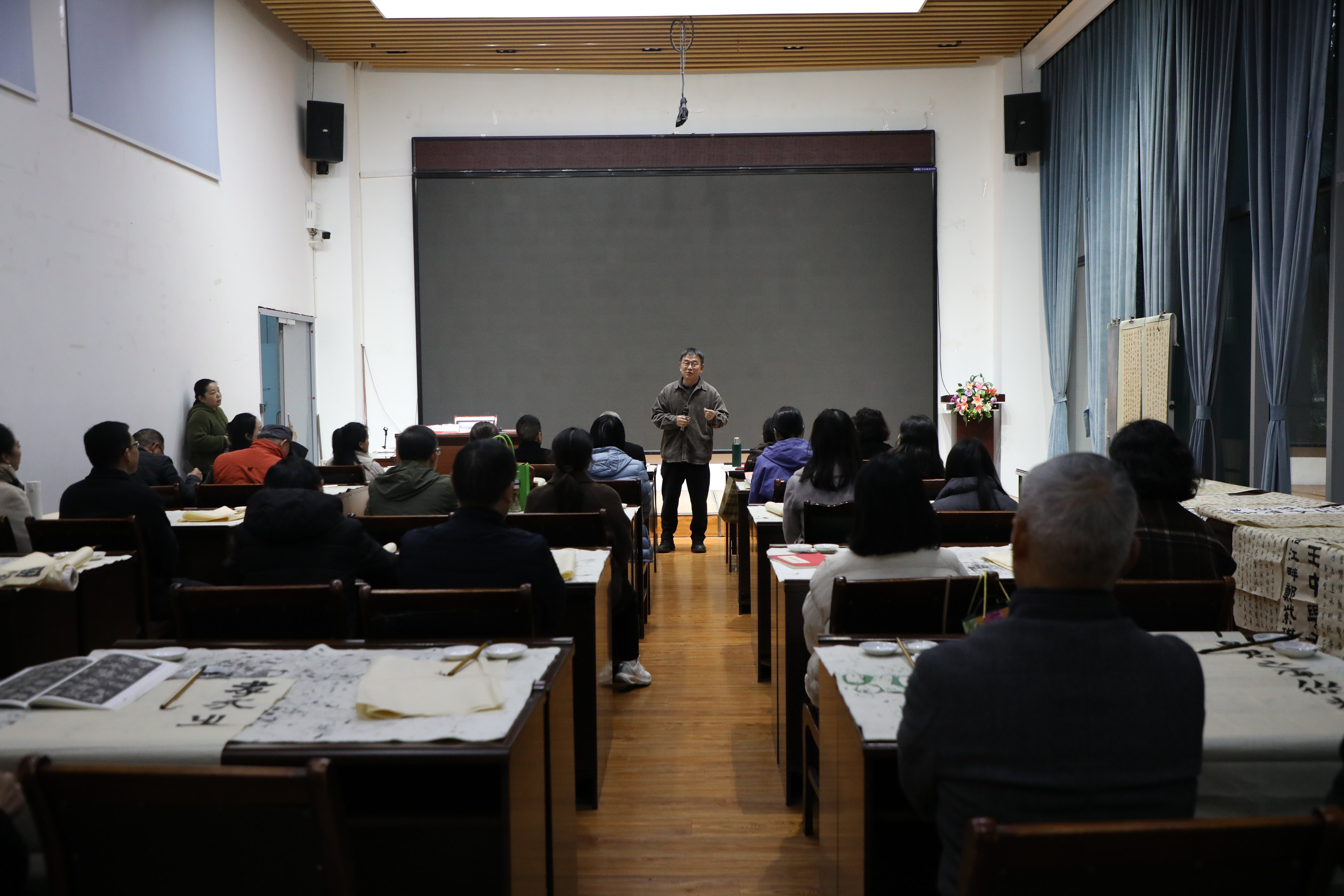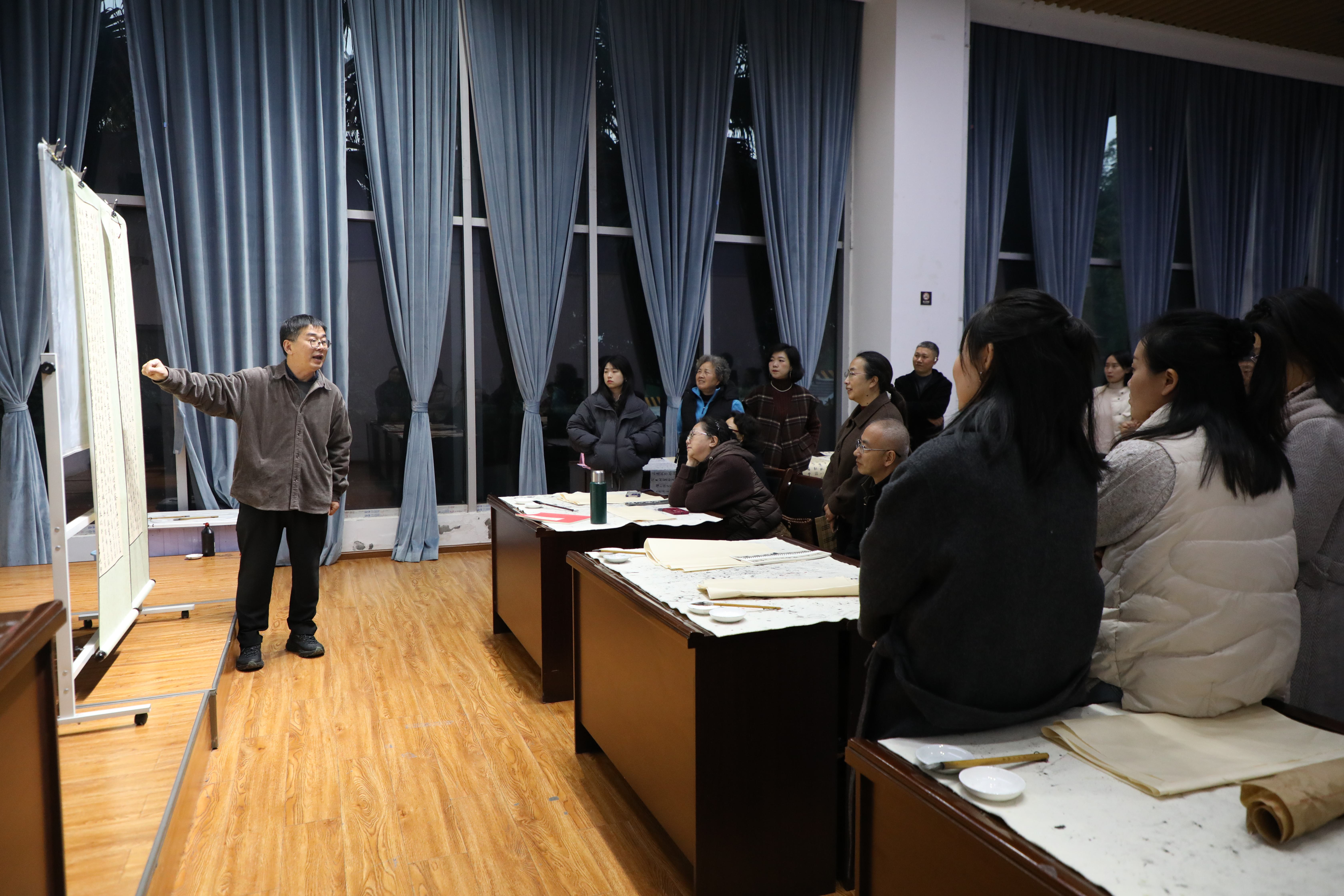 授课伊始,龚小膑逐一品鉴学员书法作品,从笔法运用、结构布局到墨色层次,进行精准点评与细致指导,既肯定学员的进步与亮点,也针对性指出作品中存在的不足,提出切实可行的改进建议。随后,他结合自身数十年书法研习经历,分享了笔墨传承中的心得感悟,从经典碑帖临摹技巧到书法创作中的意境营造,从日常练习方法到审美素养提升,以通俗易懂的语言和生动鲜活的案例,为学员们打开了书法艺术的新视野。