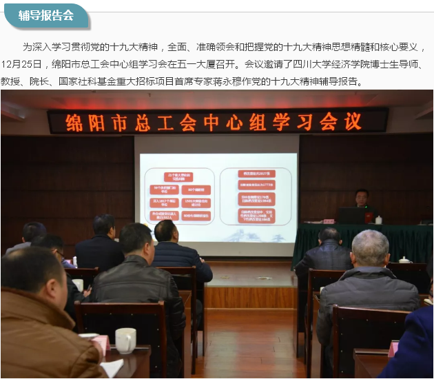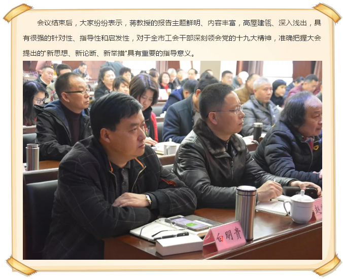 报告会上,蒋永穆教授结合自己的亲身经历,用身边鲜活的案例来讲解十九大精神,从党的十九大的主题和主要成果、习近平新时代中国特色社会主义思想、过去5年的历史性成就和历史性变革、中国特色社会主义进入新时代、“两个一百年”奋斗目标的战略部署、我国经济社会发展重大战略部署等方面,对党的十九大精神进行了系统、全面、深入的讲解,对“不忘初心、牢记使命”进行了详细、生动、具体的阐述。