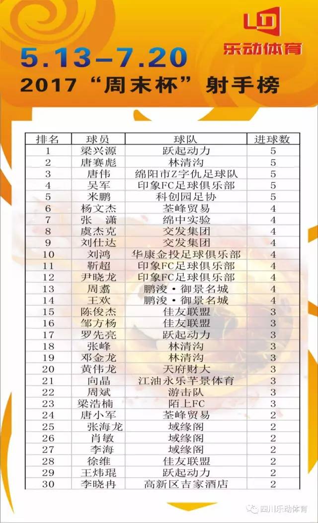 6月10日上午十点,周末杯A组第四轮在绵阳师范学院游仙校区进行,本场比赛由印象FC主场迎战阳光老男孩。第22分钟,阳光老男孩37号吉姆接8号张鹏飞的助攻打远角得手。第31分钟,印象FC36号李宾助攻24号靳超扳平比分。第61分钟印象FC 24号靳超接7号吴军助攻梅开二度。第66分钟7号吴军点球主罚命中,比分反超为3:1。第71分钟,印象FC18号熊磊取得进球。4:1!第78分钟印象FC 24号靳超助攻7号吴军进球。5:1!印象FC大胜阳光老男孩。